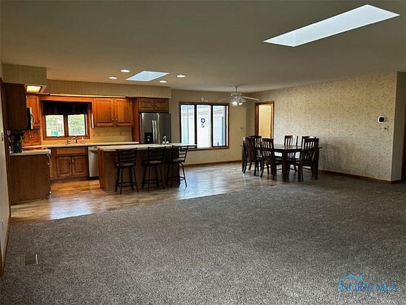 Unique county location just a minute from town. 2.8 acres with 40x40 pole barn, 24x30 detached garage plus oversized attached 2 car garage on home. Home features a desirable open floor plan w/large kitchen island and dining area. 3 spacious bedrooms plus lower level rec room. Small den for home office and enclosed porch. First floor utility room w/ washer and dryer. Updates include new carpeting 2025, new well 2024, new roof 2024. Solid construction on home throughout w/ 6" exterior walls. Beautiful location overlooking the countryside. A must to see! Call now for this rare opportunity!