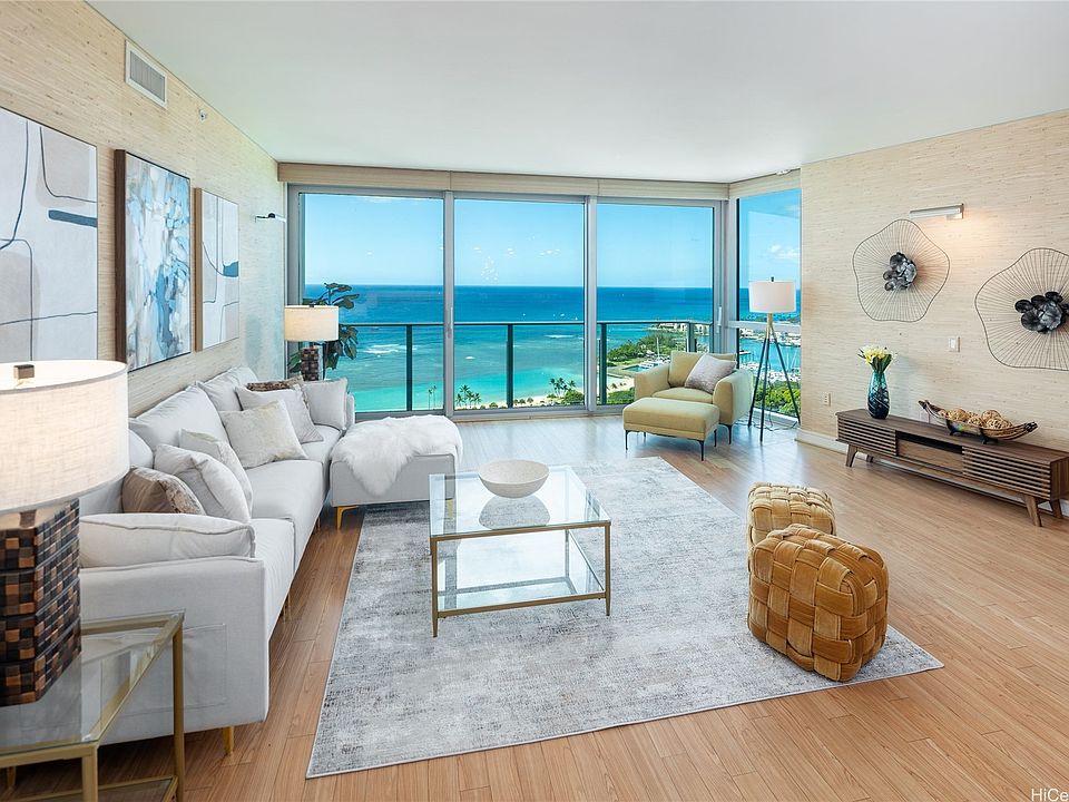 The Hokua at 1288 Ala Moana is one of Honolulu’s finest luxury residences. Experience stunning, unobstructed ocean and coastline views from this tastefully upgraded end unit with 3 parking stalls. This spacious, light and bright “B” unit offers high floor-to-ceiling windows, a nicely upgraded kitchen leading to an open living area with delightful design elements such as grass cloth wallpaper, art lighting, electric blinds and built-ins. The large primary bedroom has a generous walk-in closet plus a luxurious bathroom suite with a custom walk-in shower and vanities. The unit boasts three parking spaces (a single stall and 2 tandem stalls) and storage locker all on parking level 2, located near the elevators. The amenities at Hokua are second to none, featuring resort-style indoor and outdoor amenities, including a fitness center, heated swimming pool, BBQ areas, tennis court/pickleball courts, dog park, playground, guest suites, 24/7 security, and so much more. All conveniently located just one block away from Ala Moana Shopping Center, Ward Villages, restaurants, theaters, shops, the boat harbor and directly across from the world-famous Ala Moana Beach Park.