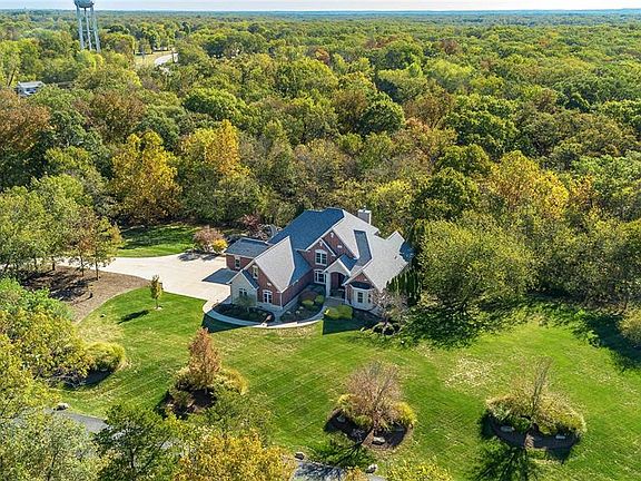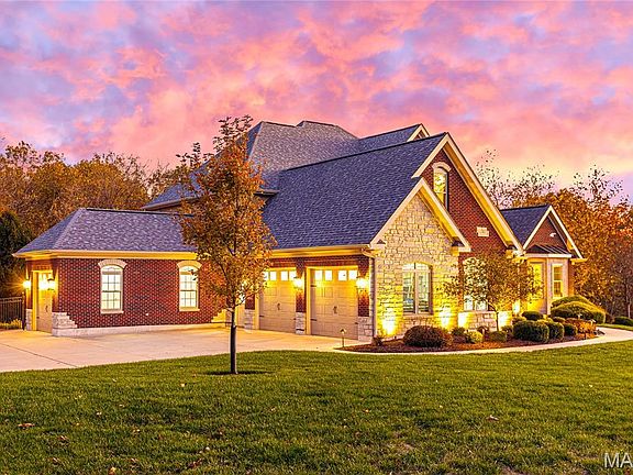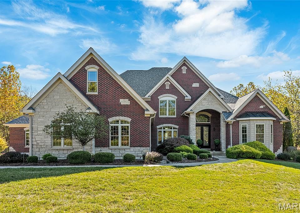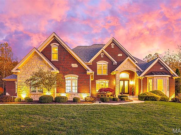 Spectacular brick & stone estate home on 3.5 acre grounds features best-in-class finishes and amenities throughout. Impressive front porch entrance with 8’ double wrought iron doors leads to 2-sty hardwood foyer, elegant dining room framed by wide scalloped entryways and stunning great room with stone fireplace flanked by 2-sty windows. Designer kitchen with 42'' buff cabinetry, granite countertops, professional grade stainless steel appliances & 8’ center island adjoins light-filled breakfast room that opens to terrace & outstanding hearth room with stone fireplace. Coffered primary bedroom suite with wide bay window & luxury bath with freestanding tub & shower spa plus a 2nd office / guest suite with full bath complete the main floor living quarters. Oak staircase accesses 3 additional bedrooms, 1 with ensuite bath & 2 with Jack n’ Jill bath plus large bonus room. Lower Level entertainment space includes recreation room, game room, fitness studio, 2nd kitchen & full bath. Atrium doors open to outdoor living area with covered patio, Baker free form resort style pool with grotto & waterfall plus flagstone patio with fire pit surrounded by landscaped gardens. Oversized three car garage with built-in storage cabinetry & service staircase to lower level. Award winning Francis Howell school district.