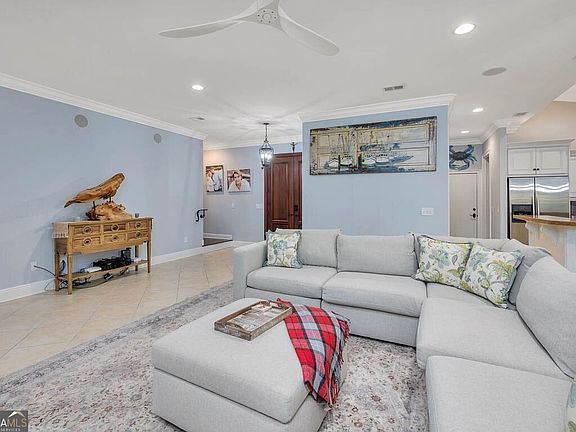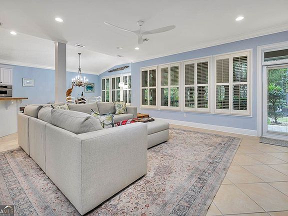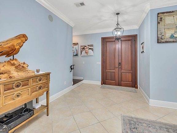 Immaculate Spanish Mission-style home located in the highly desirable coastal community of Tolomato Island. This beautifully maintained residence offers over 3,000 sq. ft. of luxury living and includes an adjoining lot for a total of 1.05 acres surrounded by lush, professionally landscaped coastal Georgia scenery. A grand 8-foot mahogany double entry door opens to a bright, open floor plan highlighted by a wall of windows that flood the space with natural light. The living room features built-in surround sound with an in-wall subwoofer, all controlled by a Legrand On-Q data wiring system. The gourmet kitchen showcases custom cabinetry, Turkish stone countertops, a hand-forged copper apron sink with Rohr fixtures, and top-of-the-line KitchenAid Superba appliances including a convection oven, convection microwave, gas cooktop with Broan exhaust hood, stainless dishwasher, and double-door refrigerator. The main-level primary suite features a coffered ceiling and private parlor room with closet. The luxurious primary bath offers dual vanities, a garden tub, and a frameless glass shower with Hans Grohe fixtures, along with a convenient walk-in closet. Upstairs, two private wings are connected by custom-forged steel handrails. The east wing includes a mid-stair office area and large bedroom with full bath, while the west wing offers a sitting or flex area leading to two spacious bedrooms with a Jack-and-Jill bath. Additional features include a Generac Guardian 25kW generator, 12-zone Wi-Fi Rain Bird irrigation system powered by a deep-water well, full landscape lighting, 500-gallon in-ground propane tank, Pentair Fleck water filtration and softener system, Lincoln double-pane bronze aluminum-clad windows, and a clay tile roof with up to 100 years of life. The home also offers a two-car garage with storage shelving, security system, built-in audio with room-by-room controls, six-inch crown and base moldings, eight-foot interior doors, and a three-zone HVAC system with a recently replaced main unit. Tolomato Island residents enjoy resort-style amenities including tennis and pickleball courts, a pool and pool house, community dock, boat storage, a freshwater lake, nature trails, and scenic parks. This exceptional home blends timeless design, modern comfort, and superior craftsmanship-offering the very best of coastal Georgia living