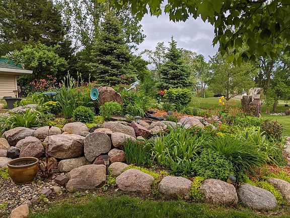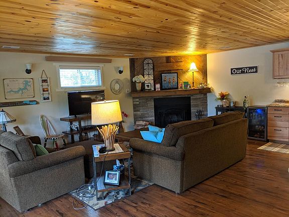 This cozy berm home is nestled in trees and beautiful landscaped gardens on almost an acre of land. Enjoy the sound of birds as you sit on the covered patio area and the look at the lake. The home is updated with new fixtures, trim, and appliances. Having everything on one level is an added bonus! The newly constructed garage has plenty of room for all the lake toys. It also has a bunk room for extra company that can fit extra beds and has an attached full bathroom. There is also a motorhome/camper outlet on the garage. There is so much this property has to offer! Please call for a showing today and make this your dream lakehome!