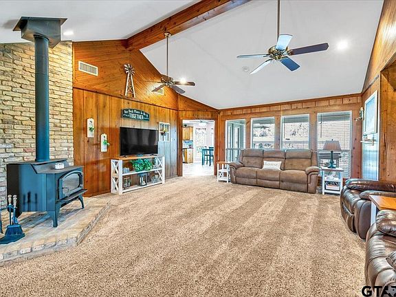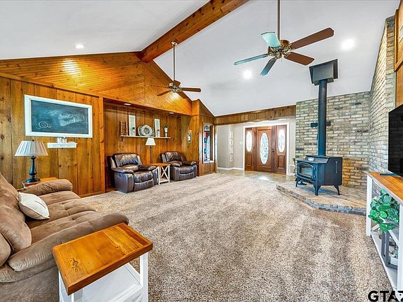 Take me home, country roads! This absolutely picturesque homestead is located in the highly sought after Lindale school district. The beautiful ornamental automatic gate leads to a 12+ acre property with 2 Bass/Bluegill stocked ponds, a recently updated 2182 square foot home with metal roof. The updated kitchen features a large island, buffet, pantry & tons of cabinets/storage, and a breakfast room with bay window that overlooks a large covered outdoor entertaining area and beautiful pasture. The large family room has a vaulted ceiling and woodburning stove. The split floorpan is great for your growing family. In the primary suite you will find a large walk in closet, beautiful tiled shower, and an ensuite office area that could double as nursery or workout space. Two guest bedrooms have large closets and dressing areas and a jack & Jill bathroom with double sinks. The convenient 1/2 bath for guests is just off the family room. There is a large workshop with craft room, chicken coop, and equipment barn on site. Look no further!