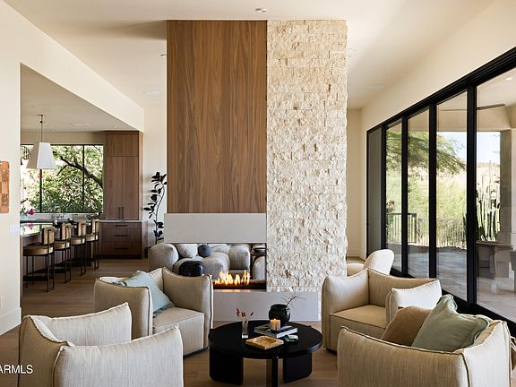 Sitting atop the premier lot in Scottsdale Mountain, this 2025 luxury rebuild is where bold design meets total serenity. Designed by Kaitlyn Wolfe and executed by Primelane Development, this 4 bed, 4.5 bath modern villa stuns with curated finishes, a reimagined open floor plan, a showstopping 3-sided floating fireplace and indoor/outdoor living. The modern kitchen now offers a fully functional prep kitchen and flows to an expansive pool deck with the biggest panoramic mountain and skyline views seen in Scottsdale Mountain. The primary suite is a private retreat, wrapped in clay wash and organic textures and tiles, entered through a custom pivot door it really is your oasis. Lot is sided by NAOS on 3 sides offering total privacy and mountain views from every room. 3 car finished garage.