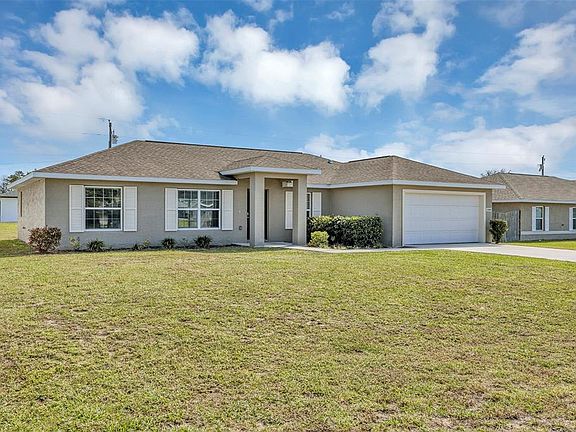 Step into the contemporary appeal of the Banyan Model, built in 2021 and perfectly situated in the desirable Marion Oaks community. This like-new, 4-bedroom, 2-bathroom split plan offers excellent flexibility; the fourth bedroom is ideal as a guest suite, home office, or den. The heart of the home is an inviting open-concept living area featuring elegant Cathedral ceilings that enhance the spacious feel. The layout provides a seamless flow from the living room to the separate dining area and into the modern, well-appointed Kitchen. Designed for efficiency and entertaining, the kitchen features a large eat-at island, beautiful solid wood cabinets with soft-close doors and drawers, gleaming granite countertops, a suite of stainless steel appliances (dishwasher, range, and microwave), and an undermount sink. Quality finishes are found throughout: tile flooring covers the kitchen, bathrooms, and laundry room, while brand new carpet provides comfort and warmth throughout the rest of the home, including the living areas and bedrooms. The private Owner's Suite serves as a relaxing retreat, complete with tray ceilings, a ceiling fan, and a large walk-in closet. The en-suite bathroom has a large walk-in tiled shower and stylish granite countertops atop solid wood cabinetry. The guest wing of the home includes three spacious bedrooms and a full bath with a tub/shower combo, granite, and a solid wood cabinet. Additional modern conveniences include a dedicated inside laundry room, a pest defense system, easy-to-clean tilt-in windows, and a garage door opener. This well maintained home offers the perfect blend of style, function, and comfort. Schedule your private tour today!