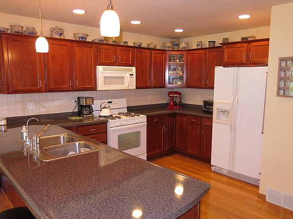 Move on up to this lovely west side home! Enter the inviting two story foyer and hardwood floors leads through out the first floor. Desirable office with French doors and living room serves many creative purposes. Open great room, dining and kitchen look out to patio and landscaped back yard with wooded views. Two fireplaces plus pellet stove! Family room and full bath finished in lower level. Nearly one half acre landscaped yard and three car garage.