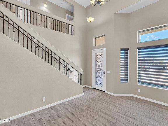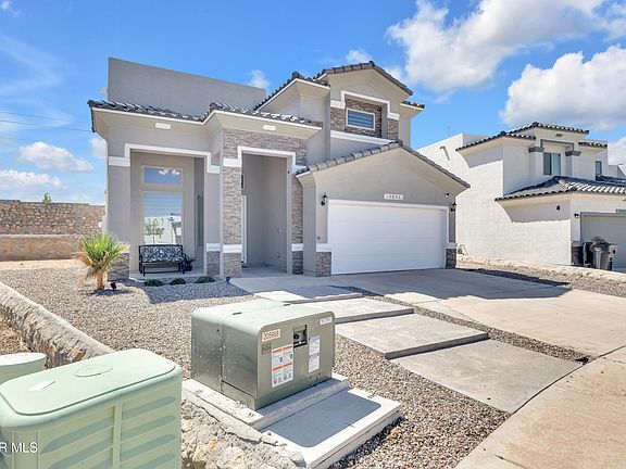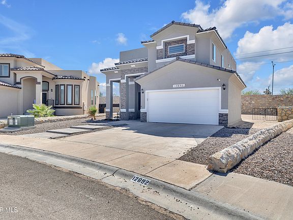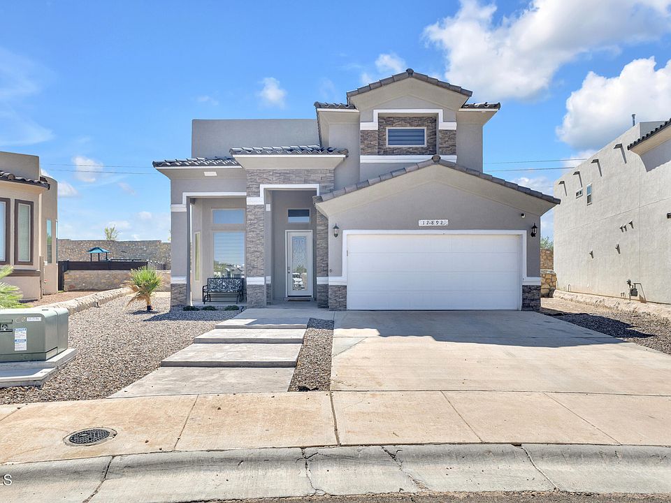 Welcome to this stunning two-story home with modern design and thoughtful details. The exterior offers great curb appeal with stone accents, sleek lines, and a two-car garage. Inside, soaring ceilings and iron stair railings create a grand first impression. The open kitchen features granite countertops, stylish backsplash, stainless steel appliances, ample cabinetry, and an island that flows into the dining and living areas. A walk-in pantry provides excellent storage. The spacious living room offers natural light and comfort, while the bedrooms include soft carpet, custom window treatments, and neutral tones. Bathrooms are beautifully updated with granite counters, modern fixtures, and a walk-in tiled shower. The primary suite includes dual sinks, a large vanity, and extra storage. Additional highlights include sleek flooring, ceiling fans, a separate laundry area, and a low-maintenance backyard ready for your touch. This move-in ready home is a must-see!