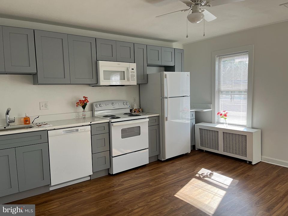 Stainless sinkHardwood floorsCeiling fanNeutral carpetBuilt in microwave