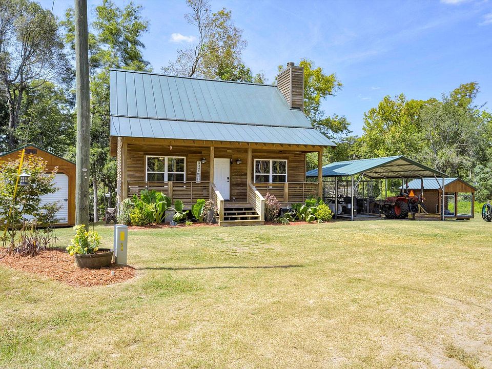 Situated on a 0.67-acre lot and built in 2019, this Cypress sided cabin features 1,008 square feet, including 2 bedrooms, 1.5 bathrooms and an efficient floorplan that's as functional as it is cozy. With 8-inch tongue-and-groove pine floors and ceilings, custom plantation shutters, a standing seam metal roof, and covered porches spanning the front and back, the home offers rich character in so many details.