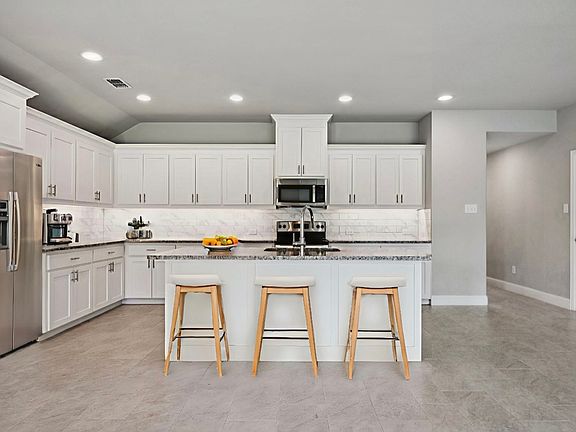 Step inside to a sunlit living area that blends effortlessly with an oversized chef's kitchen, making it a haven for culinary enthusiasts. The kitchen boasts an expansive island ideal for both meal prep & casual dining, framed by generous cabinet space & stylish under-mount LED lighting. The granite countertops & marble-look tiled backsplash elevate the kitchen's design, giving it an unmistakably high-end feel.