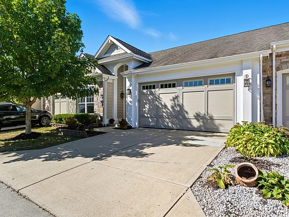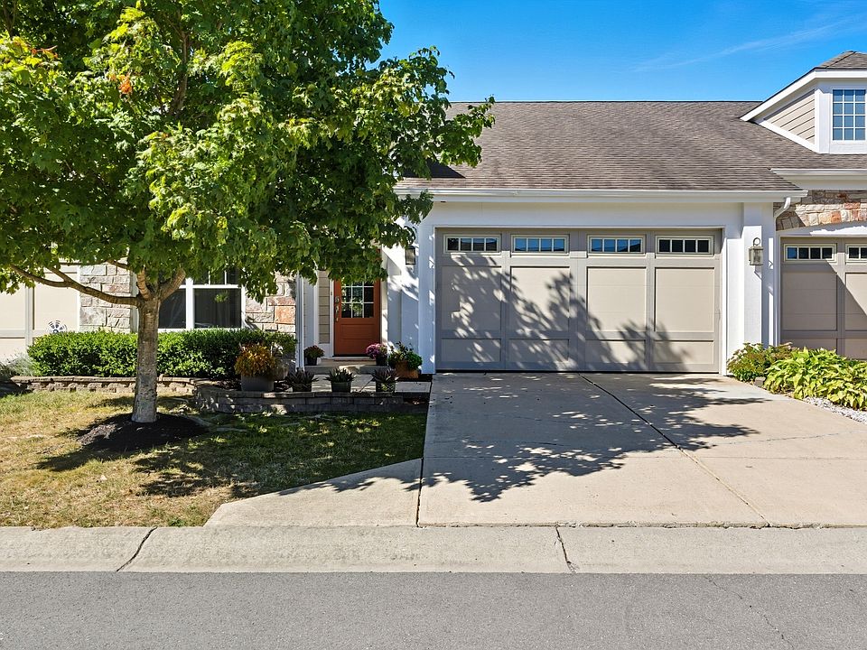 Welcome to this immaculate 2-bed/2-bath condo that is truly move-in ready. The welcoming stone front entry with/ dormer detail gives this home exceptional curb appeal. Step inside to find 9-foot ceilings, 8-foot doors, and new luxury vinyl plank flooring. NEW in the past 1 to 5 years: HVAC, humidifier, bathrooms, custom closet shelving, electrical and lighting upgrades, paint, and security system. The 2024 standout kitchen refresh gives a big bang for entertaining with additional cabinets, a bookcase, an enlarged island, quartz tops, and SS appliances. Whew, all that and a 300+ sqft outdoor oasis with privacy landscaping, a peaceful pond, and a scenic walking trail-perfect for morning coffee or relaxing anytime. Seller is sad to leave this peaceful patio! Attached finished two-car garage with additional built-in storage. The location could not be better, with walkability to a grocery store, shopping, a plethora of dining options, and easy biking. All this with no yard work! This is a must-see!