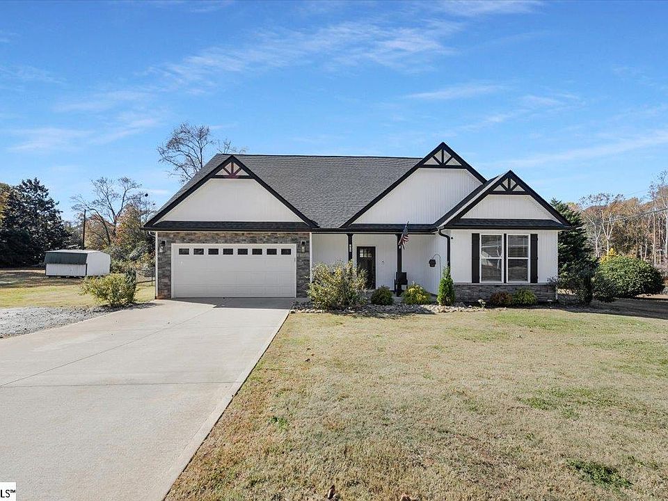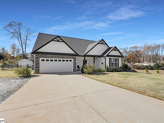 Welcome to 129 James Avenue! This exceptional 4-bedroom, 1-Story, RANCH residence situated on approximately half an acre in the heart of Wellford, SC—offering the freedom of no HOA and the convenience of true single-level living. Built in 2022, this home showcases stunning custom details and a thoughtfully designed open-concept floor plan. From the moment you step inside, you’ll appreciate the craftsmanship, including custom tray and coffered ceilings, beautifully made doors, and designer finishes throughout. The kitchen is a standout with premium Café appliances, a classic farmhouse sink, and timeless quartz countertops, creating a perfect space for everyday living and entertaining. The split-bedroom layout provides comfort and privacy, with the primary suite featuring a luxurious tiled shower, separate garden tub, and an expansive walk-in closet. Enjoy outdoor living with a charming covered front porch, a rear patio, and a fully fenced, level backyard—ideal for gatherings, pets, or play. The property also includes a detached outbuilding with electricity, perfect for storage, projects, or a workshop, along with an attached two-car garage for added convenience. This home is truly move-in ready and offers all the benefits of modern construction paired with custom craftsmanship. Don’t miss your opportunity—schedule your showing today and experience one-story living at its best! Located between Greenville and Spartanburg, you’ll enjoy an easy commute to all areas of the Upstate, with I-85, I-26, Hwy 176, and Wade Hampton Blvd all only minutes away.