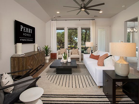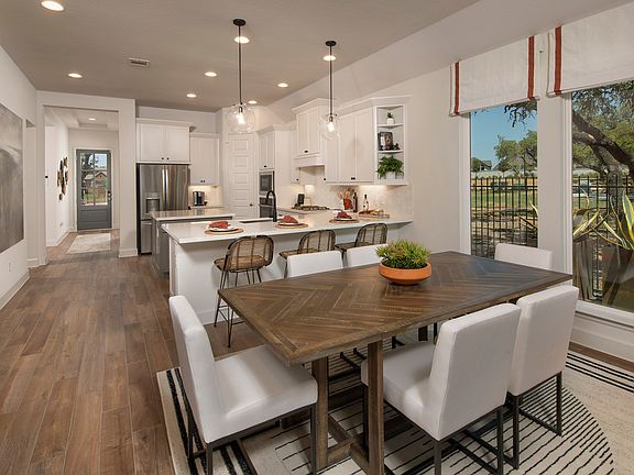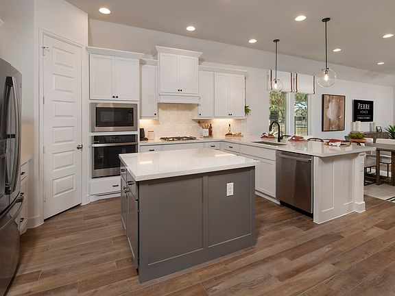 Former Model Home. Home office with French doors set at entry with 11-foot ceiling. Open kitchen offers center island and corner walk-in pantry. Dining area opens to spacious family room with wall of windows. Private primary suite includes bedroom with wall of windows. Dual vanity, corner garden tub, separate glass-enclosed shower and large walk-in closet in primary bath. Abundant closet space and natural light throughout. Covered backyard patio. Representative Images. Features and specifications may vary by community.