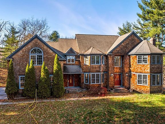 Stately shingle style home on 2 acre private country setting boasting 7,000 Plus Sqft with a flexible floor plan creating unlimited options. High ceilings throughout. Stainless steel appliances, cherry cabinets, granite countertops in custom executive kitchen. Enjoy space for casual and formal dining room. Open concept sun-filled, two story great room featuring floor to ceiling stone fireplace, ample windows and French doors to 3 private decks. Home office includes a wall of built-ins, hardwood flooring and bay window. Front to back formal fireplaced family room for gatherings and study. Cozy master bedroom with lots of natural light. Tray ceilings, spa-like master bathroom with two walk in closets. Five oversized bedrooms are on the 2nd Floor. Third floor sanctuary with outdoor fireplace and open sky and nature for stargazing and serene setting. Finished walk-out lower level with separate kitchen area,oversized bedroom and bath is perfect for guests, in-laws, au pair and entertaining.