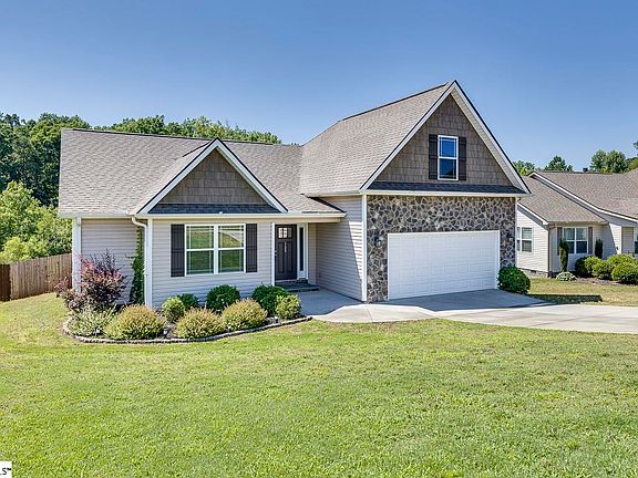 Welcome to 129 Lyman Lake Road! This freshly painted, squeaky clean move in ready, 4BR (or 3+) home built in 2019 presents an incredible opportunity to enjoy a spacious and peaceful lifestyle in an ideal location, all under $350K! The home is literally down the street from beautiful Lyman Lake and there is no HOA preventing boat storage. This craftsman style home with hardy plank and stone exterior, is situated on nearly half an acre, backing up to woods, fully fenced yard, making the backyard living and entertaining space as desirable as the home! French double door open from the home to the covered deck, making this fantastic for entertaining and looking out over the beautiful backyard. The large double door walk-in crawl space is storage space enough to become a shop area, yard equipment storage or more! The open floor plan of the home on the main level gives a grand feel with arched entries and vaulted ceilings, an open kitchen, with stainless steel appliances, lots of cabinet space and pantry storage. The primary bedroom suite on main level features a trey ceiling, oversized closet and primary bathroom with dual sinks, walk-in shower and a garden tub. There are two additional bedrooms and another full bath on the main level, and upstairs you will find a spacious room that could be used as a 4th bedroom. Don’t miss your chance to own this delightful home near Lyman Lake! It offers a unique opportunity to enjoy a lovely home and spacious lot, and lake living without the waterfront price tag. Lyman Lake is a 350 acre lake that is managed by SJWD Water District. Lake Lyman Park Lodge, Park & Landing includes a public fishing pier, dual access boat ramp and lodge available for renting. Located less than 30 minutes from Greenville International Airport and perfectly located between Greenville and Spartanburg SC!