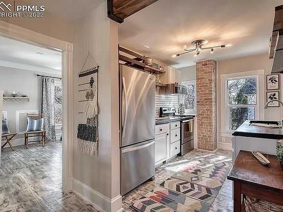 *Air conditioned* & *Option to rent unfurnished if preferred* 19th century home with a total refresh while preserving original charm. Blocks away from heart of Downtown Colorado Springs. Upper unit of a Duplex with 2 dedicated off-street parking spaces, a private entry, and a relaxing porch to enjoy the breeze. The main level features an open floor plan, beautifully furnished throughout, galley kitchen with new appliances, concrete countertops, open wood shelving, new tile backsplash and exposed brick chimney column. Master bedroom is large and conveniently located off of the living area & kitchen. Spacious bathroom with modern floor & wall tile selection, wainscoting, and artistic touches. Nicely integrated desk in family room great for working remote work. Head upstairs to loft with 2 more bedrooms, one extending into a cozy nook. Original hardwood floors whitewashed to blend historical charm with a modern rustic vibe. Keyless entry lock, and secure keyed mailbox offer convenience and comfort.