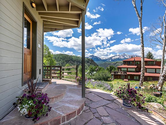 The stunning views of the iconic Wilson mountains, along with the San Sofia Ridge, take your breath away when viewed from this impressive Last Dollar Condominium. Located a few minutes west of Telluride, this private enclave receives great solar from the south facing exposure. Two bedrooms, 1 bath are located on the downstairs level, along with a washer dryer stack and clever built in office space. The primary bedroom has sliding glass doors to welcome you out to the hard-scaped patio area. The upstairs consists of the open floor plan living and dining areas, a powder room and a woodstove for cozy winter evenings. The spacious southwest facing deck, with its jaw dropping views, is located off the sun splashed upper living area. Enjoy the quiet and privacy of living outside of town,