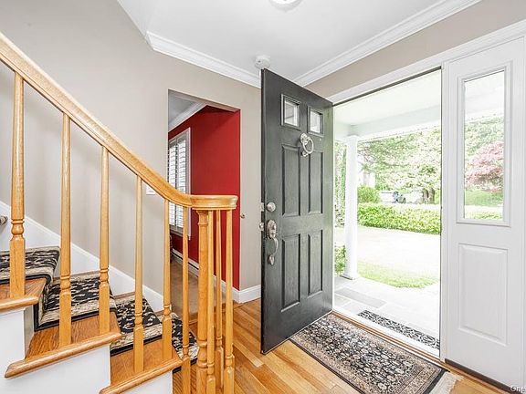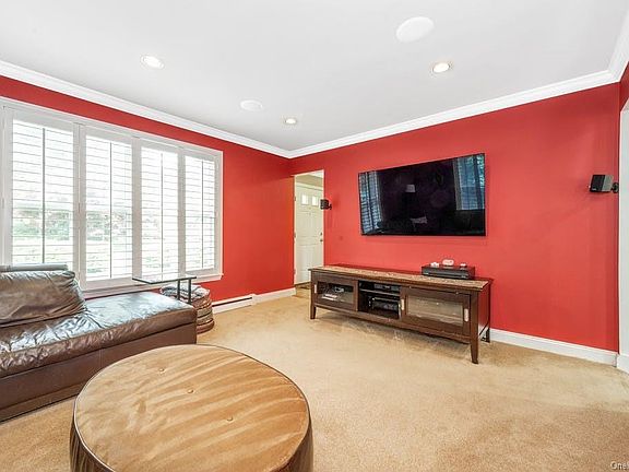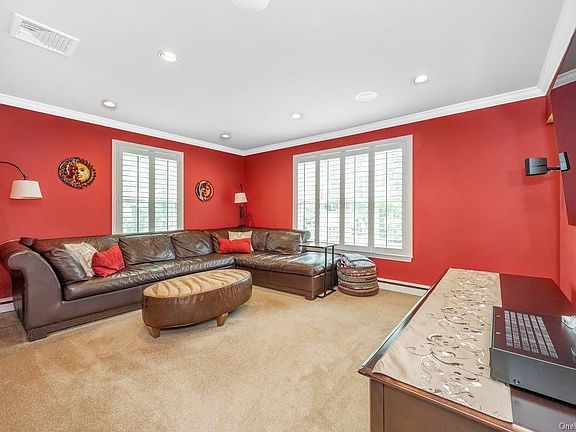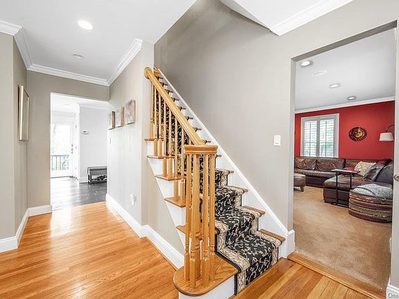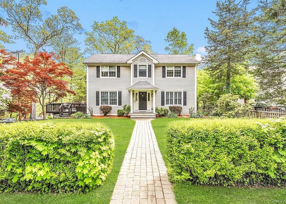 Perfect curb appeal in Pleasantville, NY. This four-bedroom Colonial is on private property in a cul-de-sac neighborhood. Welcoming entrance into the main level that features family and formal living space including an open, renovated eat-in kitchen, and dining room, with two points of access to a wraparound deck. On the 2nd level, the primary bedroom has a vaulted ceiling, a full bathroom with a jacuzzi tub and separate glass door shower, and a walk-in closet, in addition to three bedrooms and another full bathroom. The finished walkout lower level has a home office/playroom and full bathroom. New steps take you down to the level outdoor play area. Custom finishes include crown moldings, hardwood floors, renovated powder room with shiplap. Central air conditioning and connected to town sewer.