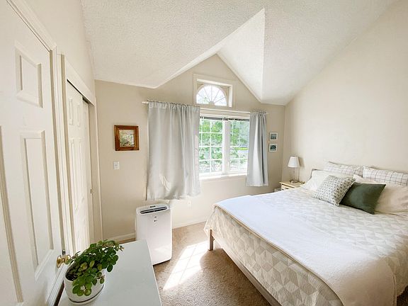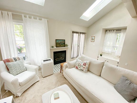 Entering the townhouse you will find a cheerful kitchen, with new dishwasher, large single-basin sink, and garbage disposal. Afternoon sunlight streams in from the window overlooking the front lawn. Enjoy bird-watching while standing at the sink, as the lilac bushes and mountain ash tree attract many different species. From the kitchen you will enter an open concept living space, with abundant natural light and airy cathedral ceilings. A cozy dining area overlooks a sunken living room, featuring a gas fireplace. Off the dining area, you will find the conveniently located half-bath, with a new vanity top, faucet, and toilet. The living room is bathed in sunlight by two brand new Velux skylights, two large windows, and entrance to the back deck. The deck includes electrical outlets, perfect for festive summer string-lights or heater for crisp fall days.