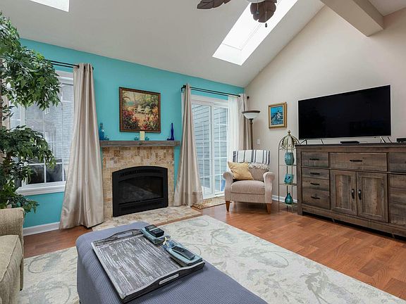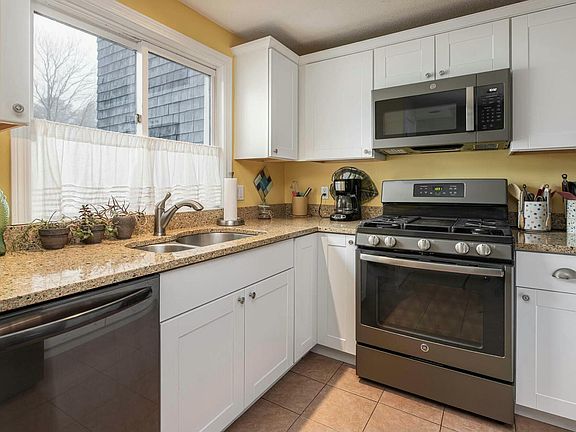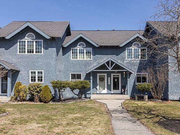 BEST MAINE BEACH is just a mile from this stylish townhouse in a quiet setting on 5 acres. From the updated kitchen with quartz counters and white cabinets you step into the dining area overlooking the sunken living room. Light filled living room with cathedral ceiling has skylights and center gas fireplace with slider and window on the side. Rear deck & plenty of room for your grill. Powder room on ground floor. Second floor has 2 bedrooms & full bath. High ceilings and spacious bedrooms. Washer/dryer on this level. FHA gas heat & pull down stairs to attic housing heating system and allowing plenty of storage.
