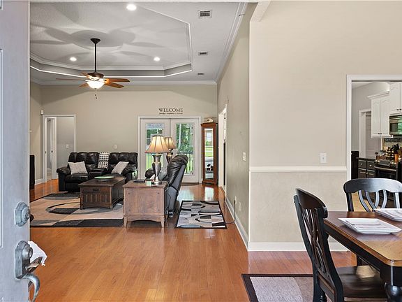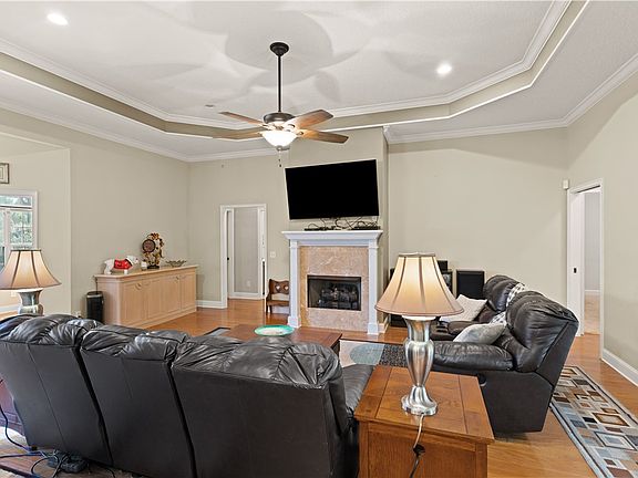 Welcome to this stunning 4-bedroom, 3-bathroom home with an office and In-law suite, located in the serene and sought-after Royal Oaks community. This home has a charming slate tile front porch and stucco exterior. Step inside to discover an interior hardwood, tile, and carpet flooring, creating a warm and inviting atmosphere throughout. The spacious living room features a cozy gas log fireplace, perfect for relaxing evenings. The kitchen is equipped with custom cabinetry, overhead shelving, black and stainless steel appliances, and a stylish tiled backsplash. Enjoy casual meals at the eat-in bar and breakfast nook, or entertain guests in the formal dining room. An additional office/study provides the perfect space for work or hobbies. Retreat to the master suite, offering dual vanity sinks, a separate custom tiled shower, a walk-in closet, and a jacuzzi tub. The additional bedrooms are spacious and filled with natural light, providing comfort and privacy for family and guests. Step outside to the slate tiled screened-in back porch, where you can relax and enjoy the surroundings. The fenced backyard is perfect for outdoor activities and gatherings. Additional features include a circular driveway, a 2-car garage, and a half-acre lot, offering ample space for parking and storage, as well as a newer HVAC that was replaced in 2020. Royal Oaks is an active community with a fabulous HOA, stocked community lake, marina, and boat storage area, making it ideal for boating enthusiasts and those who love the water. Don’t miss the opportunity to make this exquisite home your own.