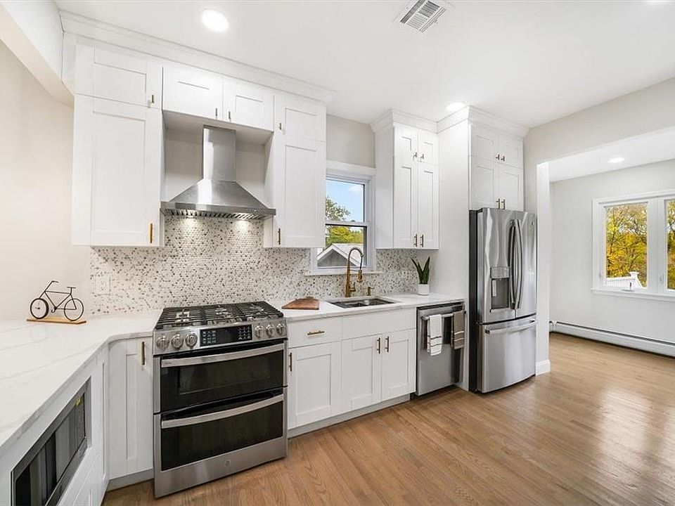 Price improvement. Character & charm meet sophistication and luxury. Enter into this classic brick, true storybook cape. Nestle yourself near the shiplap lined electric fireplace, perfectly paired with timeless weathered oak hardwood floors. Navien tankless hot water heater, as well as an oversized deck overlooks this leveled spacious yard! This magnificently crafted, custom kitchen features gleaming quartz countertops, with an eat-in peninsula, GE stainless steel appliances, a wall mounted S/S hood, self closing kitchen cabinets lined with trim & elegant gold hardware. Enjoy 9 foot ceilings throughout the main level, recessed lighting, black door hardware & a plethora of windows that gleaming with natural light! The primary bath boasts a marble tiled bench, rainfall shower head & tiled niche. On the second level, the full bath includes white subway tile, a niche, and quartz vanity. The luxurious and spacious full walkout finished basement contains double sliding glass doors, separate entrances leveled to the yard and driveway with tasteful exposed beams, black brick fireplace, and a third full bath that features shiplap accent walls, black frame doors, quartz vanity, closet & laundry room. Finishing off with a sizable leveled yard presents an expansive, oversized deck w/ board & batten siding accents and tons of room for hosting. The renovated, large two car detached garage adds the perfect space for storage or additional parking!!. Opulence awaits, schedule your private showing today! Additional Information: ParkingFeatures:2 Car Detached,