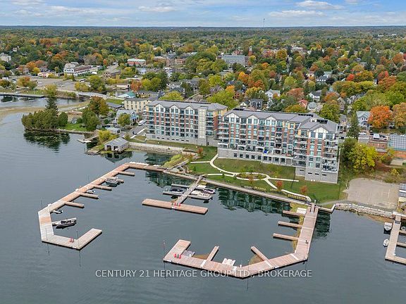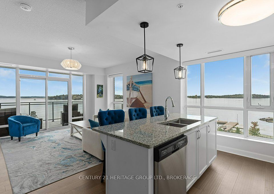 Welcome to Stone & South Gananoque's premier luxury waterfront condominium community, where elegance meets the tranquility of the St. Lawrence River. Perched on a coveted corner of the building, Unit 306 captures sweeping, unobstructed views of the shimmering river and the world-renowned Thousand Islands. From sunrise to sunset, the ever-changing light dances across the water, best enjoyed from your expansive private balcony as boats drift by in the distance. Inside, sophistication takes center stage. The spacious, open-concept layout showcases a custom designer kitchen with a large island, striking valance lighting, and top-tier appliances, a perfect blend of style and function. A dedicated dining area provides the ideal setting for hosting unforgettable meals, while the living space, framed by floor-to-ceiling windows, is bathed in natural light and designed for both comfort and conversation. This residence features two bedrooms and two baths, thoughtfully crafted with the highest-quality finishes and timeless design. Every detail has been meticulously considered to elevate daily living, offering both beauty and ease. Your lifestyle extends beyond your front door Stone & South offers a private marina for effortless river access, complete with a wider dock slip included with this unit. Additional conveniences include two underground parking spaces, in-suite laundry, and a private storage locker. Residents also enjoy access to exceptional amenities: a welcoming party room, a well-equipped fitness center, beautifully landscaped green spaces, an off-leash dog park, and an outdoor BBQ area, all designed to complement a waterfront lifestyle of leisure and connection. Ideally located in the heart of Gananoque, you're steps from charming shops, fine dining, the Thousand Islands Playhouse, the casino, and scenic walking trails along the waterfront.
