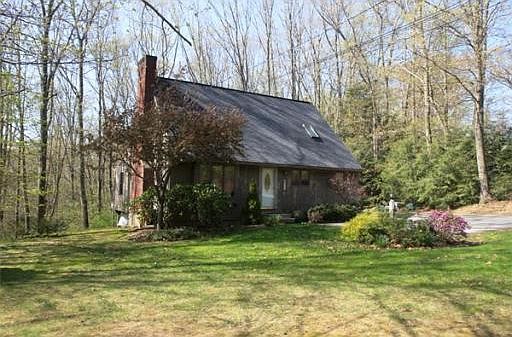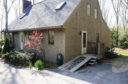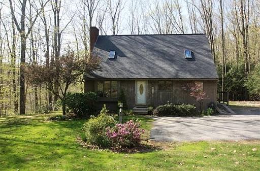 4 Bedroom Contemporary Cape on a large wooded lot. Great open floorplan featuring Living Room with cathedral ceiling, boxed beams, skylights,and impressive floor to ceiling brick fireplace with pellet insert. First floor Master Bedroom with jet tub. Kitchen with Breakfast Bar, Spacious Dining Room that opens to step down Living Room, Playroom with sliders to balcony, second Bedroom and additional Full Bath complete the first floor. The Second floor has two bedrooms, loft area over living room anf half bath. Finished Basement features Family Room with pellet stove, Home Office and workshop area.