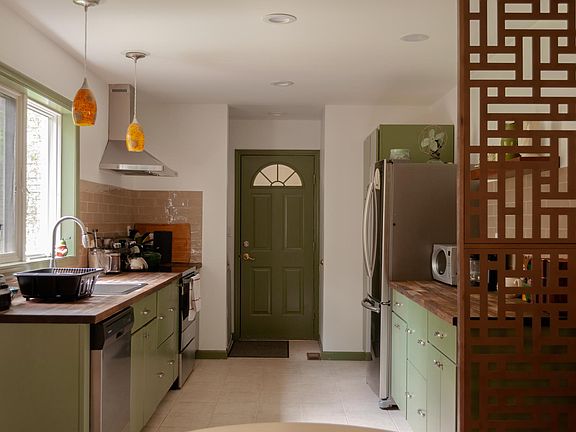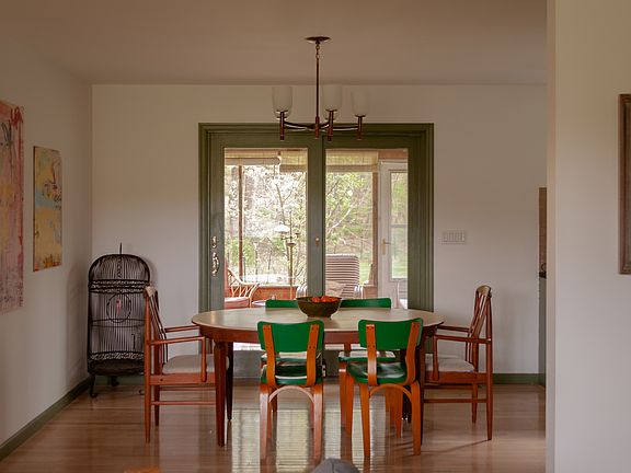 It's a special place: lovely views from generous windows, backyard surrounded by woods, screened sunroom & birdcalls in warm weather, woodstove & outdoor firepit on crisp nights. The fully furnished ranch is designed with many midcentury finds. It's also dog-friendly with a large, enclosed backyard & pet amenities.