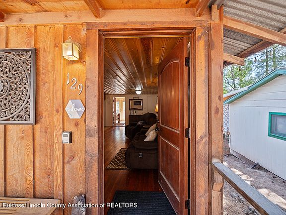 129 Taos Trl. is a 1 bedroom, 1 bathroom, just over 1,000 SF cabin. Nightly rental history available. Enter from covered front deck into wood-floor living room w/ open floor plan. Kitchen ahead with bar, gas cooktop and double-basin sink. Bedroom with en-suite bath at rear of cabin with large shower. Tiled floors in kitchen, bedroom, & bath. Large back deck w/ hot tub, grilling, & enjoying the cool mountain air surrounded by Ponderosa pines. Close to Midtown shopping, Grindstone Lake & Recreation area, Inn of the Mtn Gods, & Ruidoso Downs Race Track. Corner lot w/ ample parking at rear & near level entry (1 step). Metal roof. Natural gas forced air heat, public water & sewer connected.