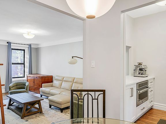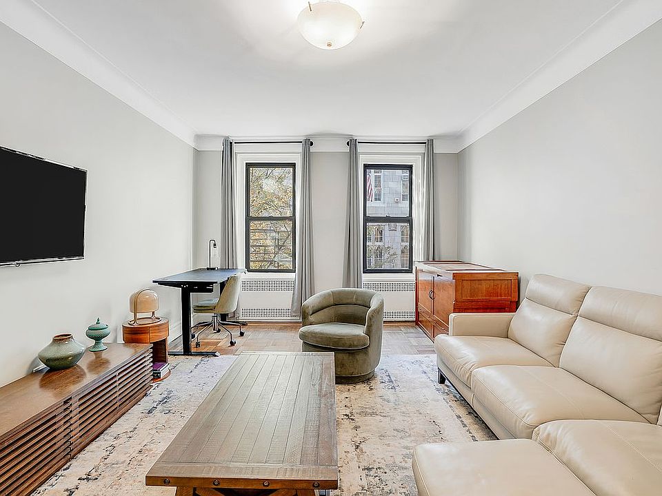 Unit #36's living room views are directly out onto a landmarked building by CBJ Snyder, with a grand and beautiful facade. The apartment building itself is situated right next to the meticulously maintained West Side Community Garden, which is a wonderful space to have as your own neighboring community garden and nature space.