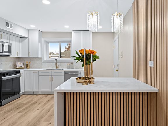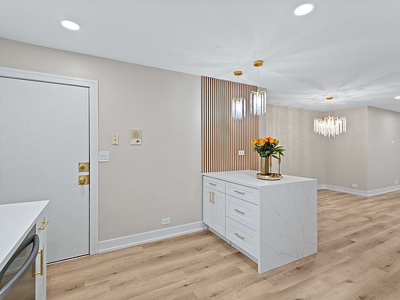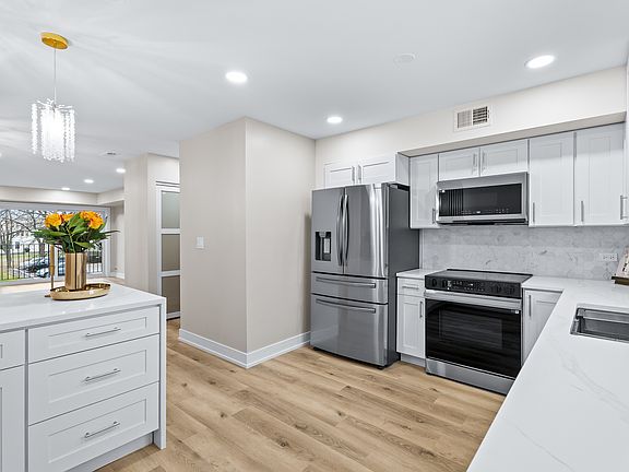 Beautifully Updated Condo in Prime Palatine Location. Welcome to this completely renovated, light-filled condo nestled in one of Palatine's most convenient neighborhoods-just minutes from charming local shops, great restaurants, and easy access to I-90. From the moment you walk in, the home feels fresh, modern, and thoughtfully designed. The stunning kitchen immediately catches your eye with its crisp white shaker cabinets, luxurious quartz countertops, and a gorgeous backsplash. The contemporary island, accented with warm slatted wood detailing, adds both style and functionality, while the elegant crystal pendant lights bring a touch of sophistication to the space. A window above the sink lets in wonderful natural light, and the brand-new stainless steel appliances complete the perfect modern kitchen setup. The open living and dining area flows effortlessly, highlighted by new vinyl flooring, fresh paint, and a beautiful chandelier that creates an inviting atmosphere. From here, step out onto your private balcony overlooking peaceful natural views-an ideal spot for your morning coffee or a relaxing evening. Both bathrooms have been completely redesigned with top-quality finishes. The primary suite features a spacious walk-in shower with modern lighting and warm, tasteful tile work that gives the space a spa-like feel. The second bathroom offers a fully updated bathtub and fresh, clean design. The unit also includes an in-unit washer and dryer, abundant closet space, and an oversized storage room conveniently located near the condo. Every inch of this home has been updated with care, offering a bright, modern, move-in-ready space that combines beauty with everyday practicality. If you're looking for a stylish, comfortable home in an unbeatable location, this one is truly a must-see.