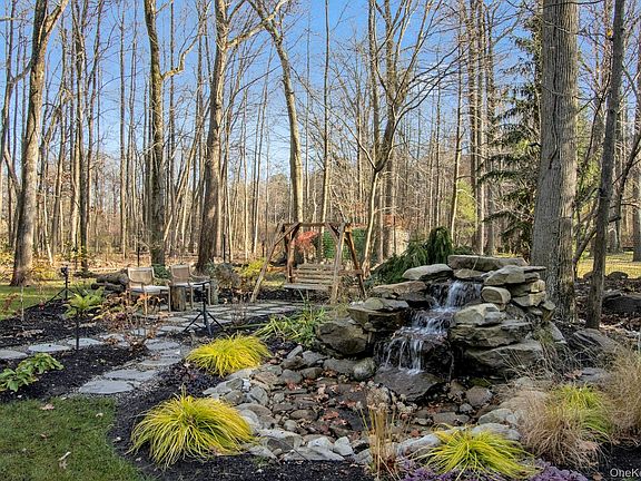 The grounds are equally extraordinary. Professionally designed by a landscape architect, the property showcases stone walls and patios, curated plantings, and multiple water features, including a tranquil koi pond with water lilies and visiting frogs. Spring brings an abundance of tulips and daffodils, while a wall of mature trees provides privacy and serenity. A detailed garden plan is available.