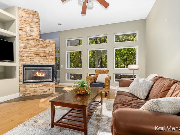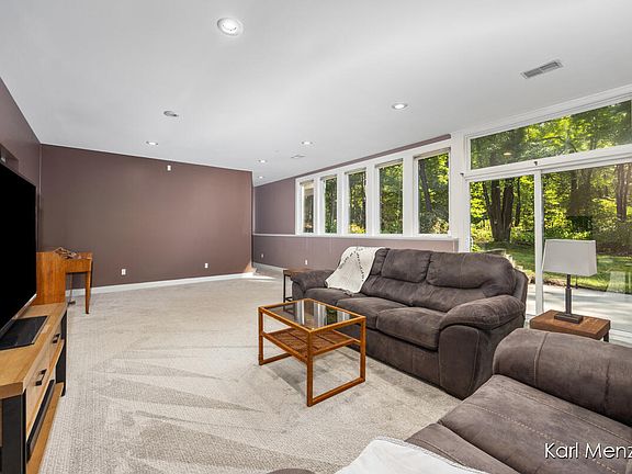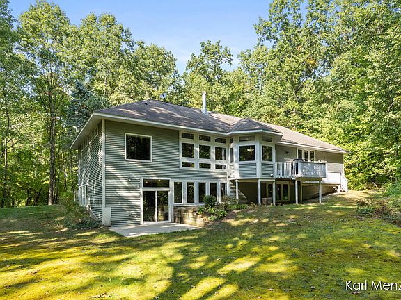 Discover a rare combination of privacy, acreage, and custom craftsmanship at 1290 Cramton Ave NE. This former Parade Home sits on 2.75 wooded acres in the award-winning Forest Hills School District, offering a peaceful retreat minutes from Ada Village, trails, shopping, and dining. Surrounded by mature trees, the open-concept main level features vaulted ceilings, maple floors, natural stone accents, and large windows framing wooded views. The main-floor primary suite includes a walk-in closet, whirlpool tub, and separate shower. Two additional bedrooms—each with their own full bath—provide comfort for family or guests. The finished walkout lower level adds more living space with beautiful backyard views and a spacious 4th bedroom. A 4th bath rough-in and a framed 5th bedroom with bath and closet offer excellent potential for future customization—ideal for a guest suite, office, gym, or media room. With 2.75 acres to explore, this property blends space, setting, and craftsmanship.