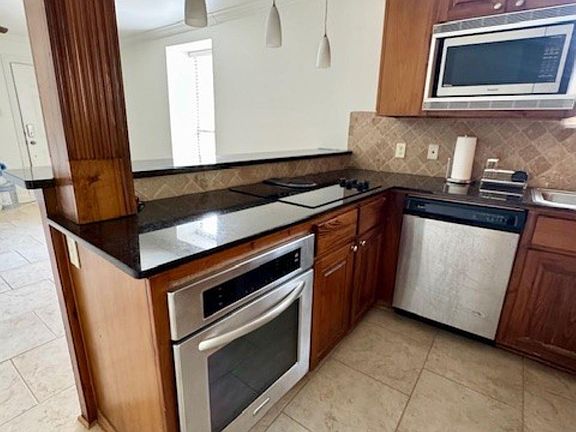 Built-in work deskStainless steel appliancesGranite countertopsCypress cabinetsWood flooring in bedrooms