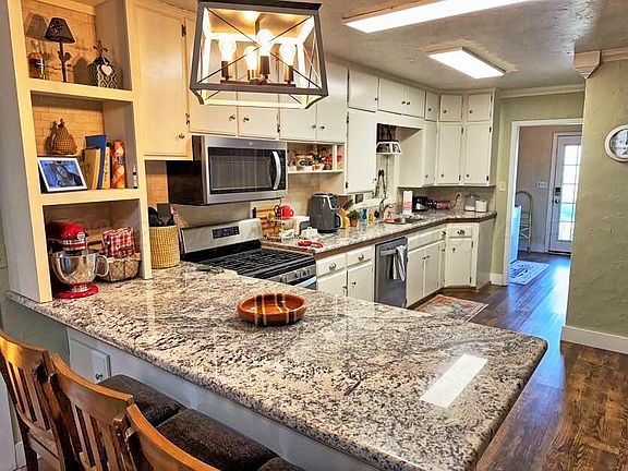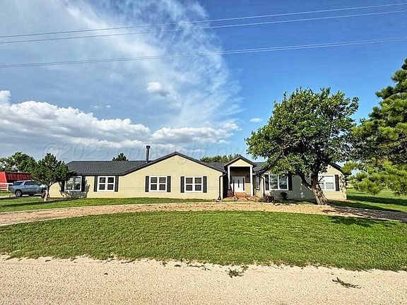 Welcome to your dream country home! This stunning stucco residence offers great curb appeal with a half-circle driveway and mature trees. Inside, enjoy an open-concept kitchen and dining area with granite countertops, stainless appliances, and ample cabinets. The cozy living room features a brick fireplace and beamed ceilings. With 4 bedrooms, plus an office that can be used for a 5th bedroom, there's room for all. The primary suite includes a luxurious bath, walk-in closet with island, and patio access. Updates include modern flooring, lighting, granite, windows, and refreshed baths. Extras: Class 4 roof, 2-car garage, storm cellar, 10 acres, and a large shop with overhead door. Come see it today!