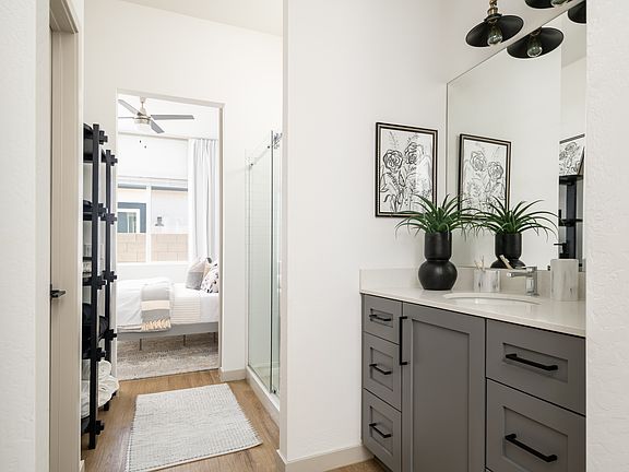 - Exterior features: 10-Foot Ceilings, 24/7 Maintenance Availability to Residents, Access to Resort-Style Amenities, Gourmet Kitchens with Quartz Counters, High-speed Internet Ready, Lower Insurance Costs, No HOA Fees, No Maintenance Costs, No Property Taxes, Oversized Windows on All Sides of Home*, Package Receiving, Pet-Friendly Community, Private Backyards with Turf, Private, Detached Units, Single Level Living, Stainless Steel Appliances, Two Tone Cabinets, Wood Style Flooring