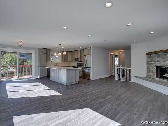 Stunning and completely redone Hillside home located off De Armoun with custom and upscale craftsman designs and finishes throughout the house. This brand new, tastefully designed, quality-built family home features an awesome open floor plan, two living areas, two fireplaces, large rooms, tons of natural light, huge windows, large laundry room, and a functional, gorgeous layout. Everything is new: New exterior and interior paint, new roof, new water heater, new boiler, new deck, new flooring (carpet and luxury vinyl plank), new kitchen (new cabinets, new quartz counter tops, new Whirlpool appliances, new bridge faucet, new subway tile), new bathrooms (tile, flooring, vanities, bath tubs), new light fixtures, new windows, new trim, new garage door, new interior and exterior doors (featuring a barn door in the master bedroom), two new fireplace designs with custom concrete hearths and driftwood mantles, new garage floor with floor drain. This amazing home is located on a large half acre lot with a woodsy setting, quiet street, wonderful neighborhood, view of Flat Top Mountain from kitchen/living/dining rooms, RV parking, tree house and room for gardening. Must see inside to really appreciate! If you'd like to make an appointment to view this home, please call 907-748-0878 or text 907-538-6914. Thank you!