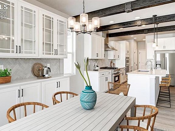 Beautiful Kirkland plan home with oversized Four-Car Garage on just over a Half Acre! This Craftsman style home has a stucco and stone exterior and a front porch. Upon entry to the home, the luxury vinyl plank flooring creates cohesion throughout the main living area. There is a bedroom and full bath immediately to the left and laundry to the right. As you walk further into the home you are greeted with the spacious and welcoming open plan. Their are ceiling beams across the great room and kitchen and the great room has a double-sided fireplace to be enjoyed indoors and out on the covered patio. The kitchen is a chef's dream with a KitchenAid appliance package that includes a 36" commercial range with four gas burners, a wall unit with a microwave and oven, an upgraded dishwasher and disposal. The kitchen also has the expanded pantry providing plenty of space for groceries and small appliances. The dining nook is cozy but can fit a 6 person table easily and has the nook cabinets with glass uppers. This room also provides access to the covered 20x15 patio which has an installed gas line for your Grill or patio heater. The primary suite in on the main level and provides an inviting area, with a glass exterior door to the patio. The bathroom has the optional upgrade with the freestanding roll-in shower and larger walk-in closet. There is an Alder-stained barn door to provide privacy from the bedroom. The finished basement has 9' foundation walls, giving it a nice roomy feel. There are two bedrooms on this level, and a full bath, as well as a very large rec room area with a wet bar. There is plenty of space for niche areas like a gym, movie area, or game tables. There is also an unfinished storage area on this level. Other extras include a sink in the laundry room, pre-wiring for ceiling fan, pendant lights over the kitchen island, air conditioning and more! A really nice home with a four car garage with the 4" extension on a large lot.