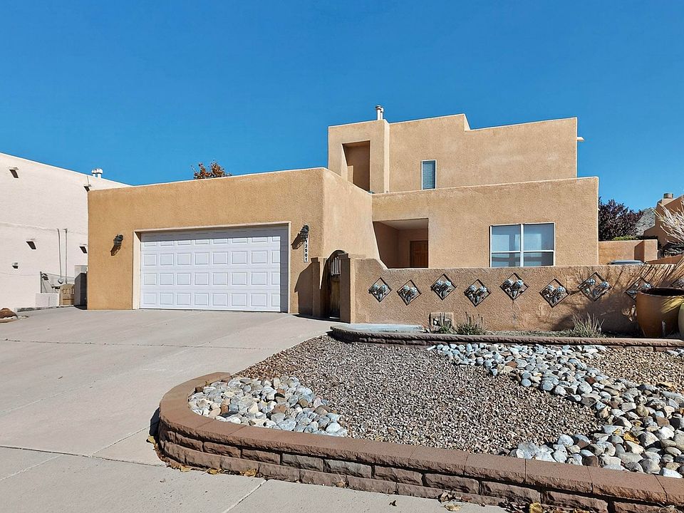 Beautiful home in desirable and established NE Heights neighborhood with stunning view of the Sandia's! Well maintained 3 bedroom 2 full bath home with 2 car garage. Tile and laminate throughout. Living room with raised viga ceilings and gas log kiva fireplace. Updated kitchen with granite counter tops and SS appliances. Second level is dedicated to the primary suite with private balcony, walk in closet, bathroom offers jetted tub, walk in shower and double sinks. The lush backyard has a covered patio with carved wood beams. Out door fire-pit area with banco perfect for taking in the views with company or a quiet night at home. Easy and convenient location, five minutes from the freeway, grocery, restaurants and retail all close by!