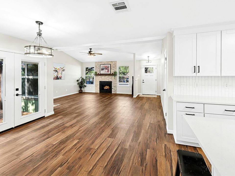 Gas fireplaceFresh paintShaded backyardNew baseboardsOpen concept floorplanBrand new windowsCozy firepit
