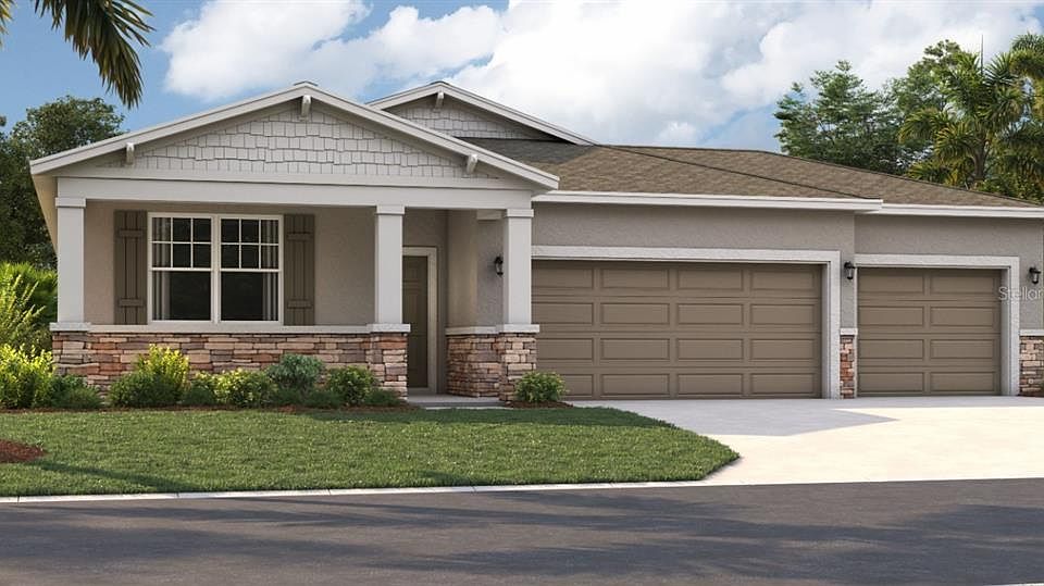 One or more photo(s) has been virtually staged. Under Construction. Discover the perfect home at Groves at Grand Island, where you'll experience the convenience of a spacious three-car garage, expansive grounds, and easy access thanks to its incredible location. Nestled between Lake Yale and Lake Eustis, and just off Routes 44 and 452, you'll enjoy convenient access to downtown Eustis, Mount Dora, and Orlando. Running errands or stocking up on groceries is a breeze with Publix Super Market only 7 minutes away. You'll also have access to local restaurants and shops in downtown Eustis and Mount Dora, just minutes away. If you're a fan of an active lifestyle and love the outdoors, you'll be thrilled to find numerous parks, lakes, golf courses, and nature preserves nearby. Experience a world of convenience and adventure while living in a peaceful, rural setting close to beautiful orange groves. The Juniper offers the perfect blend of modern design and practical living. From its spacious three-car garage to an inviting outdoor deck, this home accommodates all your living needs and keeps pace with current style standards. Three main-level bedrooms at the front of the house have access to a double-vanity bathroom and a laundry room across the hall—all thoughtfully designed for comfort and convenience! Venture further into the open-concept kitchen and dining area, perfect for gathering for dinner parties or holiday feasts. After dinner, take advantage of the spacious 17x17 living room for spending time with loved ones. The spacious primary suite includes a private bathroom with split vanities, a walk-in shower, a closet, and a toilet. Enjoy all these features and the Florida sunshine from the included patio.