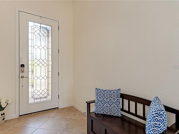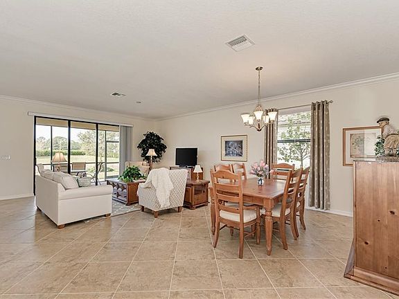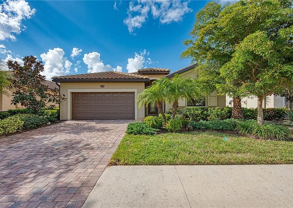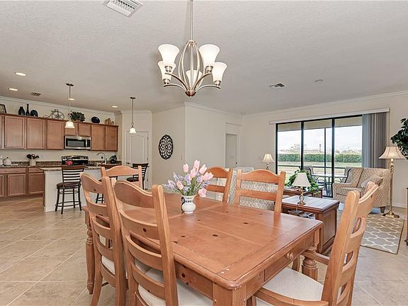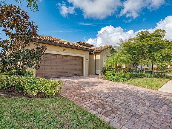 VERY POPULAR Trevi home plan in maintenance-free resort community of Gran Paradiso. This open-concept home has 3 bedrooms with a den, 3 full baths - even one private ensuite to a guest room, a 2 car garage, and a lovely small pond behind beyond the lanai. It features distinctive architectural details, such as crown molding, porcelain floor tile set on the diagonal throughout the home, granite countertops, stainless steel appliances, and kitchen island with cabinets. Enjoy some carefree living by relaxing on your cozy screened and covered lanai looking out at the pond, or there is plenty of room to extend it, could even put in a pool. All of this in the setting with resort-style community amenities, like: beach entry free-form pool, tennis, pickleball, state of the art fitness center, group classes/clubs/activities, locker rooms, saunas, steam rooms, and basic cable as well as lawn maintenance are included as well. This is truly a magnificent home. Come see why this plan is a buyer favorite. Check it out today!