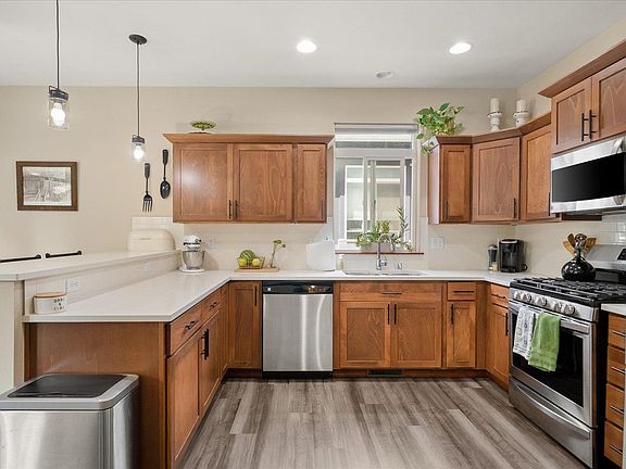 Impeccable home in the perfect location! Situated on a private lane and within walking distance to Northwood Middle school & Farwell Elementary, this immaculate rancher has it all! The bright & open floor plan features 5 bedrooms, 3 baths, 2,850 square feet of living space, main floor utilities, large windows, fully finished lower level and upgraded designer touches throughout. The stunning kitchen boasts quartz countertops, stainless steel appliances, gas stove, eating bar, and walk out to the covered back deck! The tranquil primary suite is located on the main floor and features double sinks, quartz countertops, tile shower, and large walk in closet! Step out to the fully fenced and spacious backyard with mature landscaping, sprinkler system, wonderful privacy and beautiful territorial views!