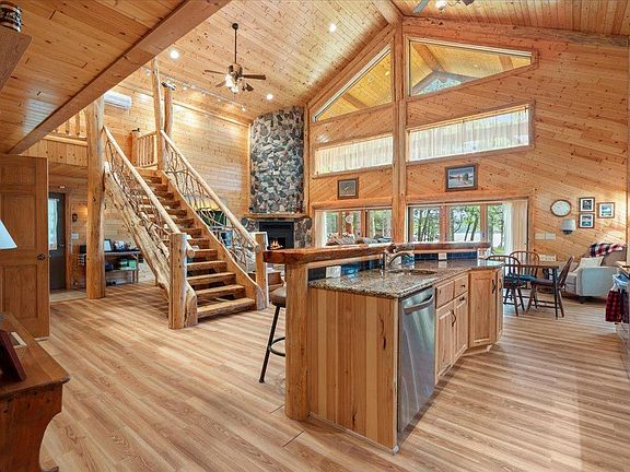 HERE IT IS... The highly sought-after and extremely elusive lakeshore with privacy! Tucked among a canopy of mature trees on over 7 acres of land with 540+ feet of lakefrontage sits this beautiful log-sided home, that makes the perfect UP-NORTH GET-A-WAY. The home features an open floor plan with a large kitchen and dining area, two main-floor bedroom en-suites with private baths, a floor-to-ceiling stone fireplace, a loft with a bedroom, flex room, bathroom, and sitting area. A span of lakeside windows and patio doors leads to a covered patio with a lakeside hot tub and perfectly level elevation down to the swimming beach and dock. Additional structures include a 32x32 detached, finished, and heated garage, a 28x24 pole shed with a concrete floor and overhead door, a 16x12 storage shed with a loft, and a vintage log bunkhouse.