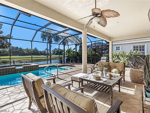 This 3,022 sq.ft. gorgeous home boasts a large open floor plan with the perfect chef's kitchen with high level granite countertops and upgraded cabinets including a breakfast nook overlooking the heated saltwater pool & spa and lake with the golf course as the captivating backdrop. The welcoming master suite has a custom California closet and an ensuite with his and hers vanities with a large soaking tub and walk-in shower. The home has diagonal tile in the living areas and engineered hardwood floors in the 4 bedrooms, formal dining and den. Other features include fully automated pool equipment with app, ambient lanai lighting with remote, upgraded ceiling fans in every room, plantation shutters, crown molding, wired exterior security cameras, new upgraded exterior landscaping, surround speaker system & more! Gated community with great amenities including a restaurant, gym, clubhouse, pool/spa, tennis court and Golfing & membership is not required. Unbeatable location in Fort Myers, FL minutes to the Airport, universities, fine dining, upscale shopping, Sanibel and Captiva Beaches.