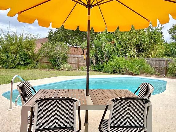 Beautifully maintained pool home. Great location on a quiet cul-de-sec. This home comes fully furnished, making it easy to settle in immediately or a perfect turnkey option for short-term rentals or Airbnb. Close to shopping, restaurants and walking distance to the elementary School. 15 mins to beach. Tile throughout house. Lots of light and views of pool & yard throughout home from 3 sliding doors and newer window. Plenty of parking with your 1 Car Garage and extra long driveway. Huge fully-fenced backyard with glistening in-ground lighted pool, large raised wooden deck perfect for your hobbies, a swing or even a band! Large screened in porch overlooks pool. Front fence has a gate which opens up to the pavered side yard with covered carport, great for your water toys & extra storage. Newer hurricane rated, double Payne PGT windows (2018) and 1 of the 3 sliding doors is newer. Gutters (2016), Newer Appliances, Water Softener, Fence 2020, Roof 2011, Hot Water Heater (Oct 2008), AC (2025).