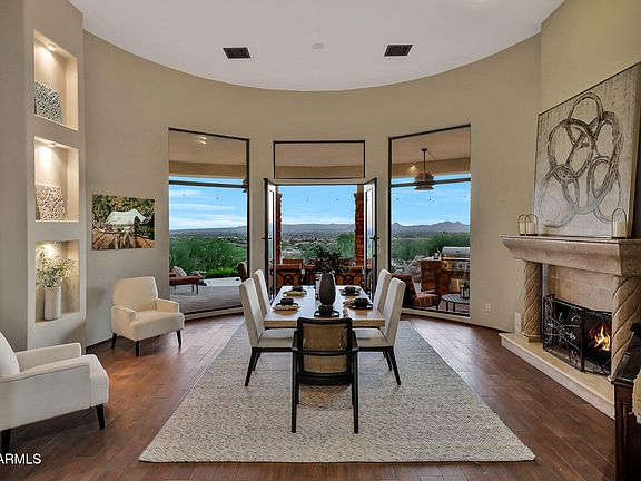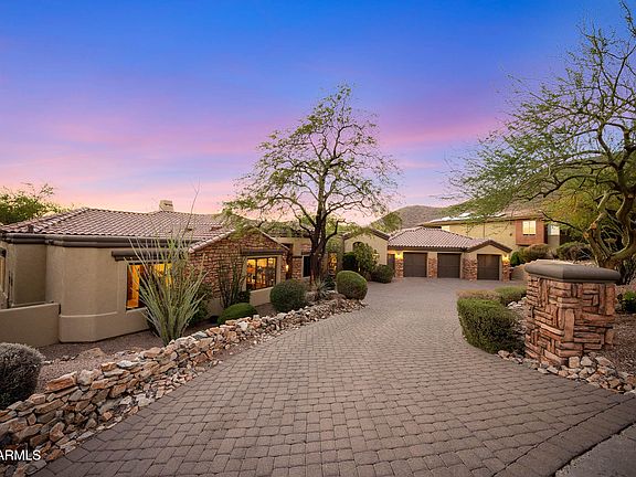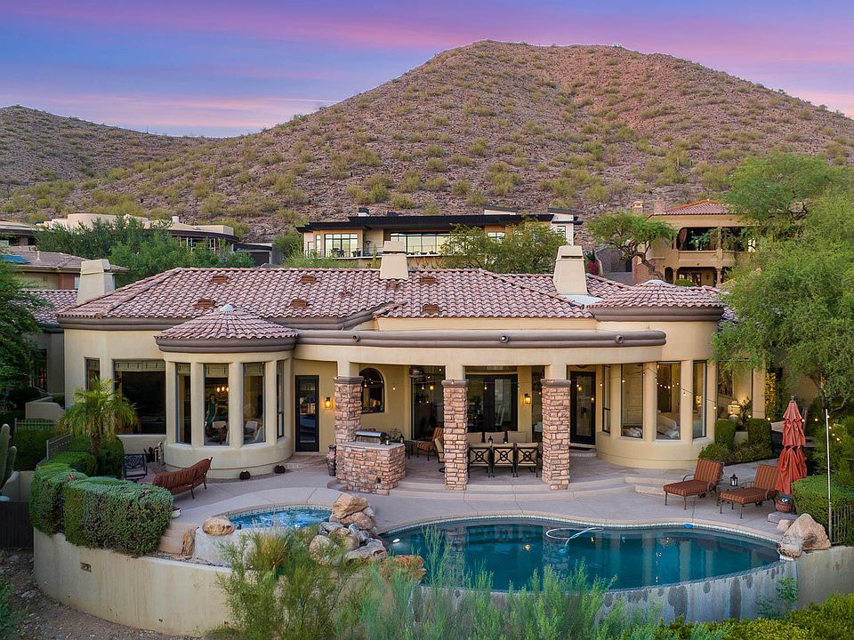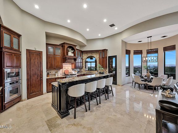 Experience luxury desert living on one of the highest hillside lots with panoramic mountain and city views, situated on a cul-de-sac in guard gated Ancala. This home boasts 14' ceilings, a renovated gourmet kitchen with Viking and Dacor appliances, 5800 bottle chilled wine cellar plus additional beverage/wine fridges, custom Knotty Alder doors and cabinetry, and honed travertine flooring throughout. Each bedroom offers an ensuite bath and walk-in closet. The primary suite features a travertine fireplace, private patio access, an oversized walk-in closet, jetted tub, bidet, and luxurious finishes. The oversized 3-car garage and fully outfitted casita with kitchenette and ensuite bath complete this exceptional home. Smart home upgrades include Nest thermostats, surround sound, central vac, and a brand-new AquaLink pool system and refinished pebble sheen pool and spa. Entertain effortlessly with a chef's gas BBQ, firepit, misting system, and large grassy yard. Additional highlights include wet bar, new LED lighting, updated fans and fixtures, custom vent covers, new carpet, remote-controlled blinds, and full brand new roof (underlayment, tile and flat portion) and new exterior paint. Truly turnkey - style, comfort, and functionality all in one.