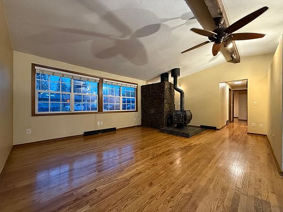 * Inviting Living Room: Features beautiful hardwood floors, a unique rock-faced wood-burning fireplace/stove, a decorative wood beam, and a ceiling fan.
