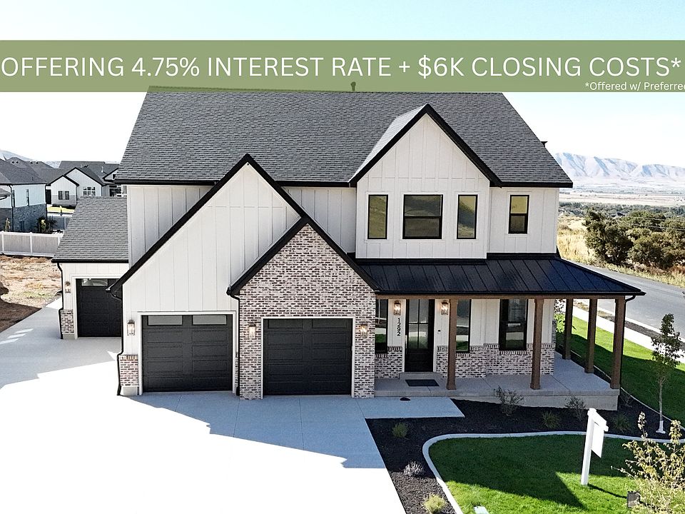 **Offering a 4.75% starting interest rate via a seller-paid 2/1 buy down and closing costs paid up to $6k. **Buyer must qualify through Seller's Preferred Lender to obtain rate buydown. Nestled on a scenic corner lot in Salem, Utah, this stunning farmhouse-style home offers the perfect blend of rustic charm coupled with modern touches, all framed by breathtaking views of the mountains and Utah Lake from the expansive back porch. Featuring 7 spacious bedrooms, big bathrooms, and thoughtfully designed living areas, this home is ideal for gatherings and entertaining. The interior boasts beautiful wood beams, elegant lighting, and custom tile work that add warmth and sophistication throughout. With 3 porches featuring overhangs, a 3-car garage, and abundant storage space, there's room for everything you need. The downstairs snack bar and theater room make for the ultimate gathering spaces, while the open layout ensures a comfortable flow between rooms. Whether you're relaxing on the porch or enjoying cozy nights indoors, this home is designed to fit every stage of life. Don't miss the chance to experience farmhouse elegance and unparalleled views in one of Salem's most desirable locations. This house is equipped with GE Cafe appliances as well as many other designer brands such as Ralph Lauren lighting throughout the house.