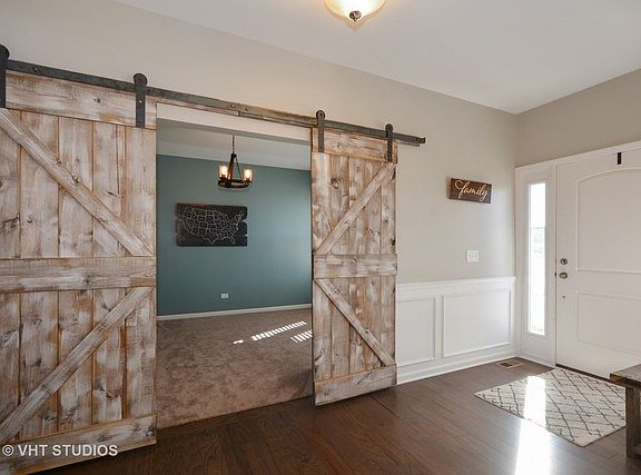 Beautiful home, only a year old with a lot of upgrades, better than buying new! Gorgeous rich, dark hardwood floors and plenty of natural light flow throughout the home's open, airy layout. Other special highlights include wainscoting in the charming foyer and formal dining room, office with sliding barn doors and rustic light pendant, chic recessed lighting and ceiling fans, Samsung High Efficiency washer/dryer on the second level, cordless lift blinds in every room, overhead garage storage racks and a ton more of storage space. The well-appointed kitchen is light and bright with white cabinets, oversized center island with seating, walk-in pantry, stainless steel appliances and luxurious Kitchenaid French Door Refrigerator. Enjoy gathering with family and friends in the generously sized two-story great room and kitchen area with huge windows and glass sliding doors that lead out to the fenced backyard with large wood plank stamped concrete patio. Also, on the 1st floor is a flex room that can be used as a den, playroom or 5th bedroom. The master bedroom, complete with two huge walk-in closets and ensuite with double sink vanity and separate garden tub and shower. The lower level offers 1,200 sf more of living space! Cozy up and watch a movie in the theater room, enjoy some refreshments at the bar or relax in the rec room while the kids have fun in the play room. Close to Metra commuter line, Randall Rd. shopping, downtown Elburn and walking distance to elementary school.